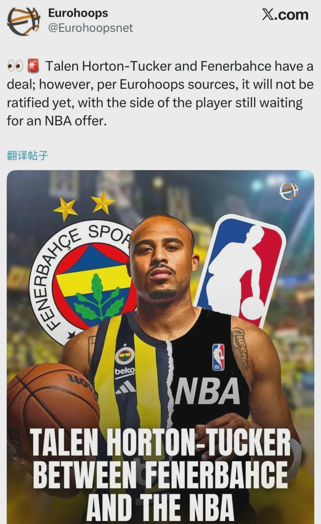 外媒报道,土耳其豪门俱乐部费内巴切和塔伦-霍顿-塔克达成加盟协议,双方签下的是一份为期1年价值100万美元的合同。