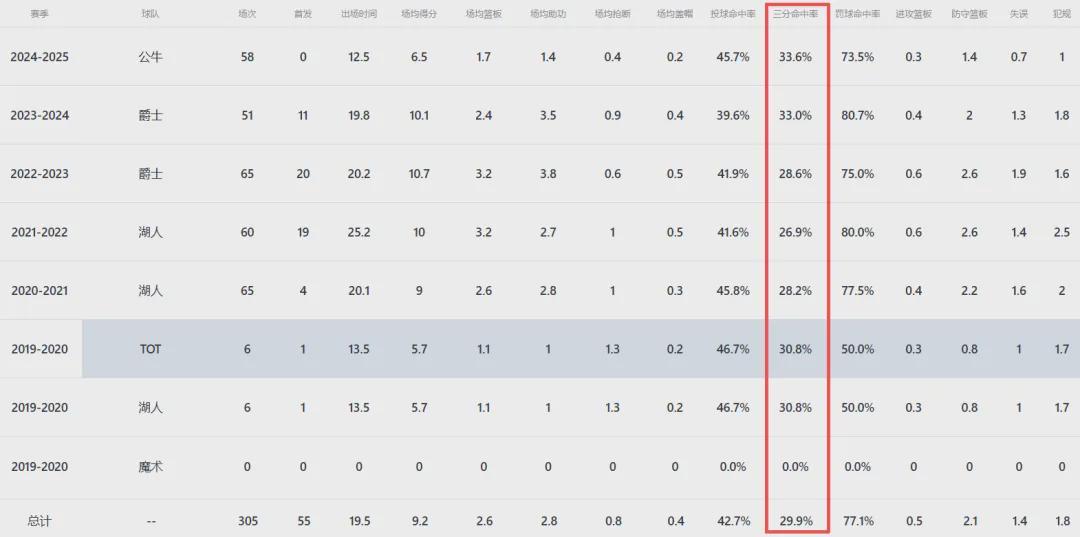 从以上数据就能看出小塔克如今在NBA无人问津的原因,即缺少投射能力,三分球水平聊胜于无,甚至可以说对手能对他采取放空的防守策略,因此注定了难有作为。